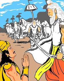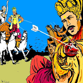 On the 15th day of the war, the great duel between Drona and Drupad was fought. Before the war, Drona sked Drupad, “This is our final chance to meet each other Drupad, lets greet each other”. But Drupad replied, “You are not even worthy of my greetings, Drona”. Drona destroyed Drupad's bow and mace. They fought with swords then, and after a long battle, Drona struck the sword in the chest of his friend Drupad killing him.